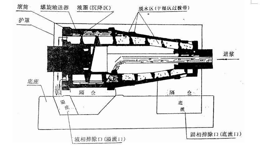 一、工作流程:離心機(jī)工作時(shí),鉆井液通過(guò)一根插入螺旋輸送器空心軸內(nèi)的進(jìn)液管進(jìn)入離心機(jī),首選在離心機(jī)內(nèi)被加速,然后經(jīng)空心軸上的噴液孔再進(jìn)入高速旋轉(zhuǎn)的轉(zhuǎn)鼓內(nèi),在離心力的作用下,由于離心機(jī)作用,產(chǎn)生離心力,位于液圈的外層,緊貼于轉(zhuǎn)鼓內(nèi)壁形成固相層,液圈的內(nèi)層最主要是液相和懸浮的膠體粘土。螺旋輸送器的刮板將貼于內(nèi)壁上的固相層,刮下來(lái)推向轉(zhuǎn)鼓脫水區(qū)。在脫水區(qū)有如洗衣機(jī)的甩干筒一樣濕淋淋的固相顆粒受到離心擠壓和離心脫水的作用,擠出所有的自由水,然后被螺旋輸送器推到轉(zhuǎn)鼓小端的底流嘴排出機(jī)體外。液圈內(nèi)層的液相和懸浮的超細(xì)顆粒由推進(jìn)器刮向轉(zhuǎn)鼓大端,由大端上的幾個(gè)滴流孔排出機(jī)體外。返回到泥漿循環(huán)系統(tǒng)。