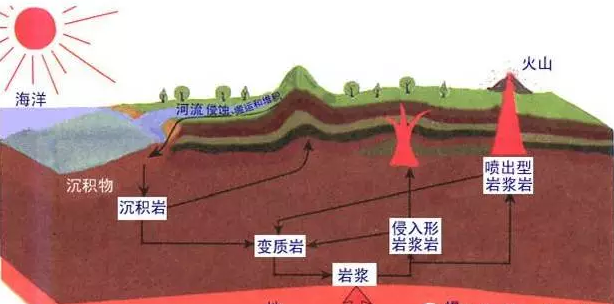 巖漿由地殼深處向淺處活動的過程稱侵入作用,在這一階段冷凝固結(jié)形成的巖石叫侵入巖。巖漿沿裂隙溢出地表或噴向天空的活動過程叫巖漿噴發(fā)或火山活動,這一階段冷凝固結(jié)形成的巖石叫噴出巖或火山巖。