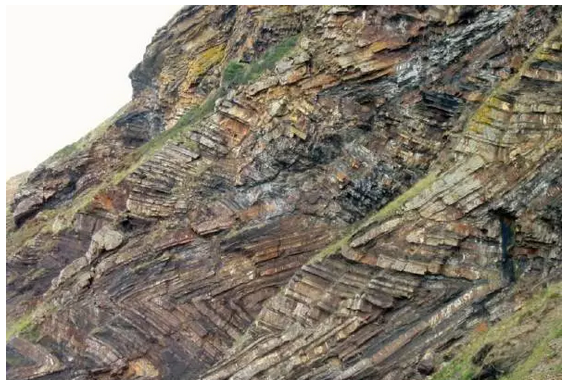 這種褶皺常被石油公司稱為V形褶皺,顧名思義就是常呈現(xiàn)V形的褶皺。常常因為當(dāng)?shù)乜箟簯?yīng)力而形成,但要成型還需要一些非常具體的條件??偣灿兴膫€發(fā)展階段:曲形成核、平行褶皺、兩翼伸開/中間銳化、尖棱褶皺收緊。